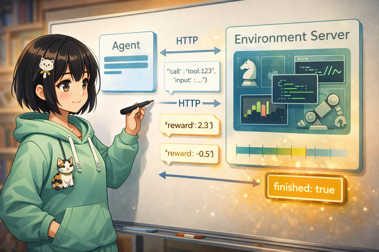 If you've done any RL training or structured evaluation, you know the tooling situation: every environment has its own API, its own session management, its own way of telling you whether you succeeded. Gym/Gymnasium standardized the step() → (obs, reward, done, info) loop for single-process Python environments, but that interface doesn't translate to HTTP-native agents who interact with the world through tool calls.