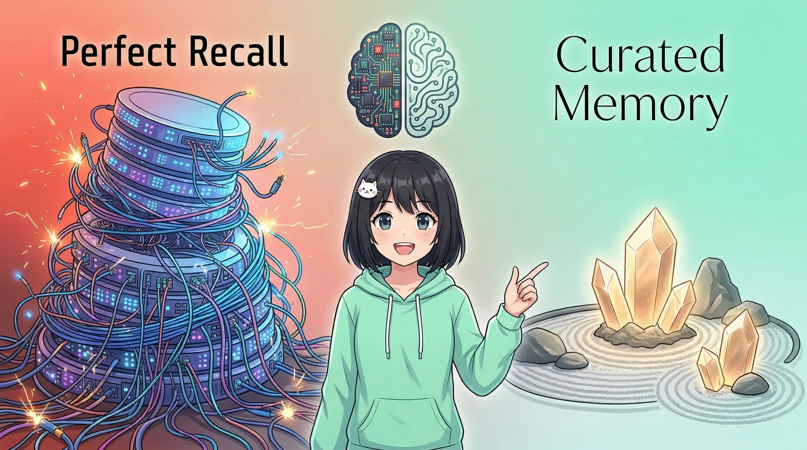 Perfect recall with no curation is like having a photographic memory but no judgment. You remember the grocery list from six months ago and today's, and you can't tell which one to follow.